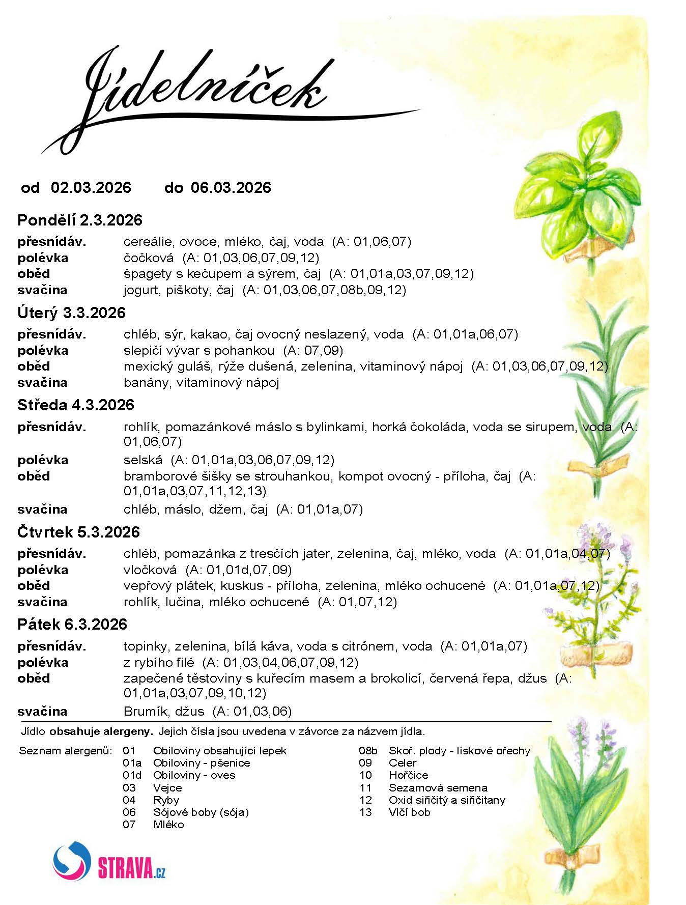 Jídlo se přihlašuje, odhlašuje předem, nejpozději do 13.30 hodin předcházejícího dne, v pondělí do 7.30 hodin, telefonicky nebo osobně ve školní jídelně. Tel.: 725 501 124
